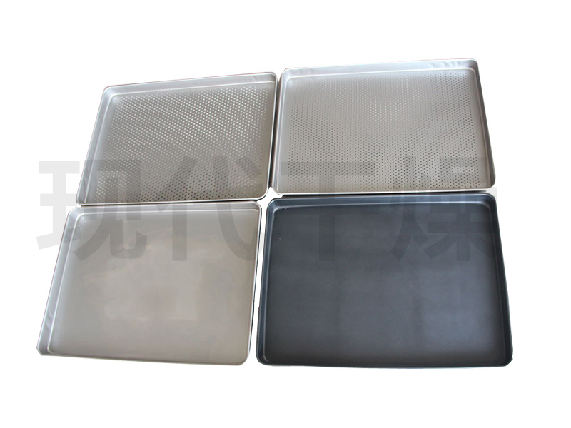 在上述各烘盘中,又以一次成型压制烘盘最为普遍,尺寸为640×460×45mm,主要由不锈钢或铝合金通过一次成型的方式压制而成,其角落光滑、四周翻边,保证了清洗彻底,及容易端托的优点,因而广泛使用在生产中。
